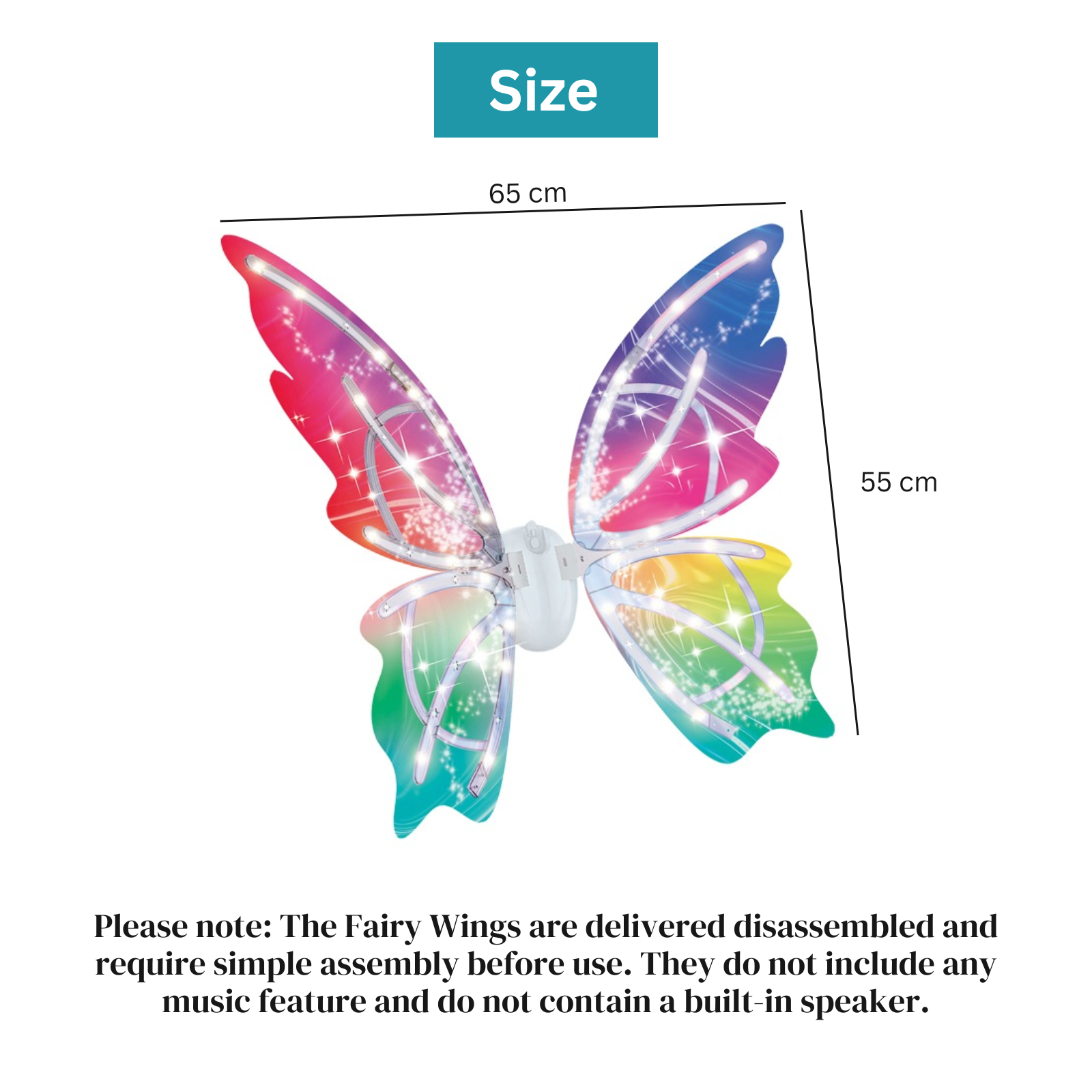 Please note: This product operates on batteries, but Batteries are NOT included in the package. The Fairy Wings are delivered disassembled and require simple assembly before use. They do not include any music feature and do not contain a built-in speaker.